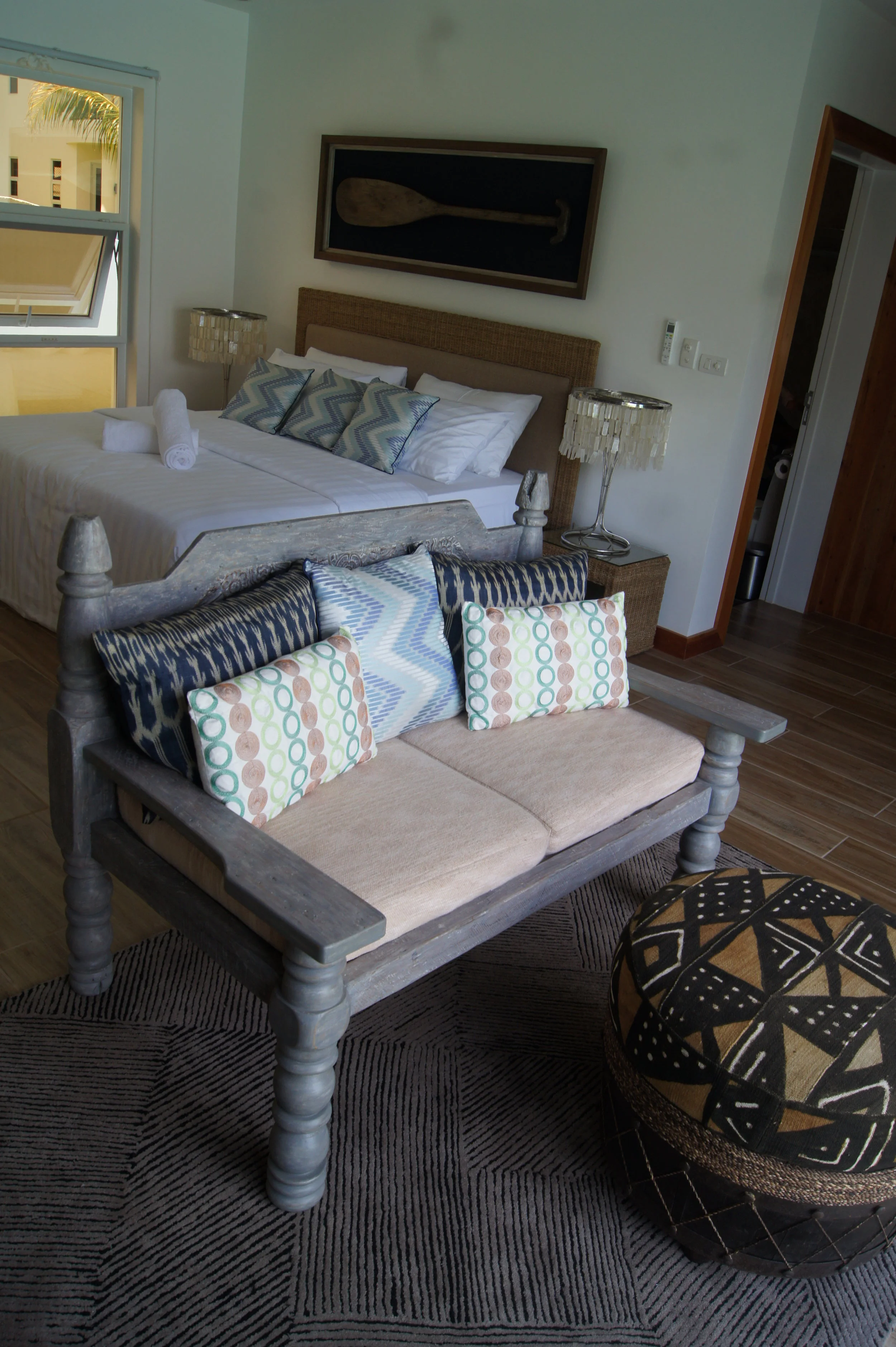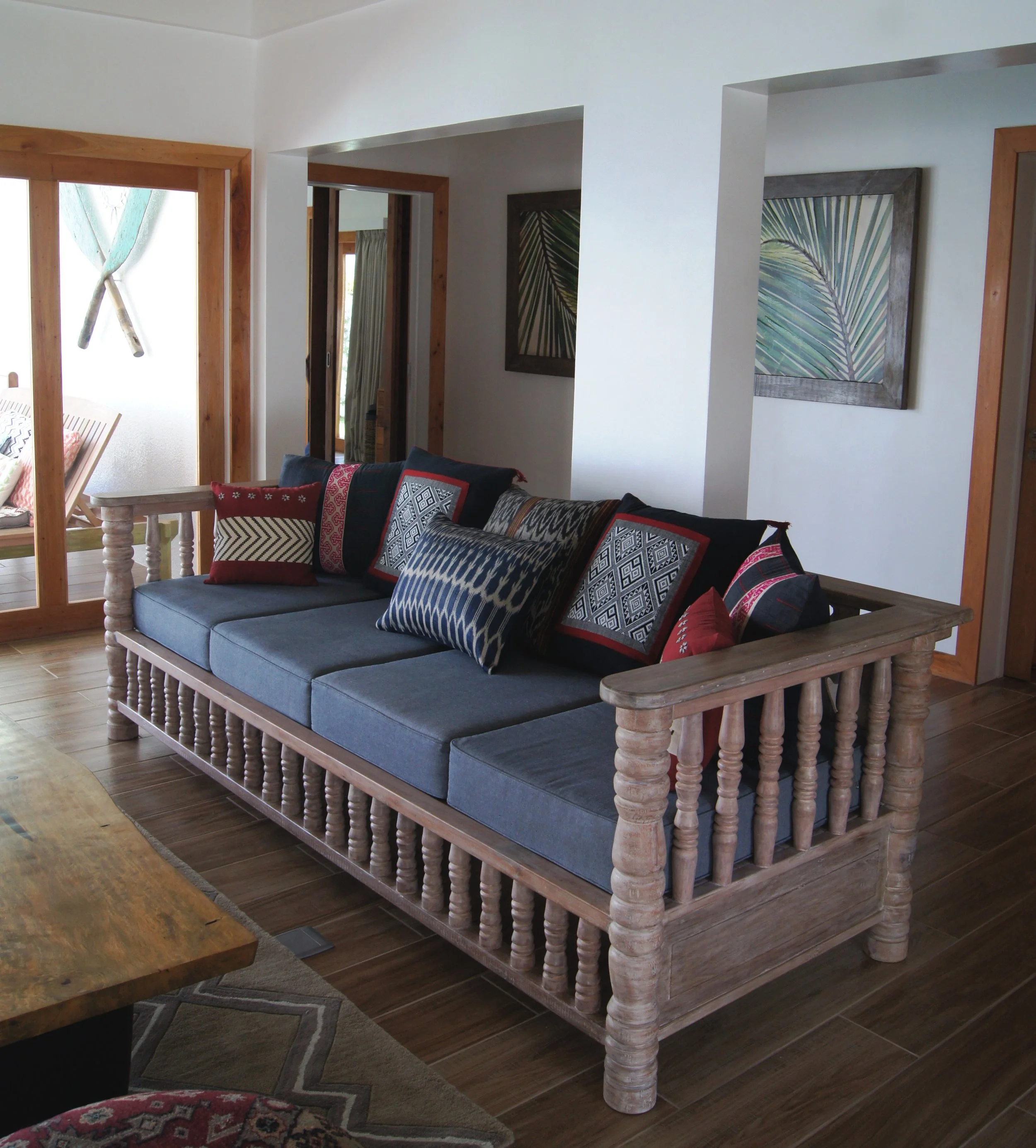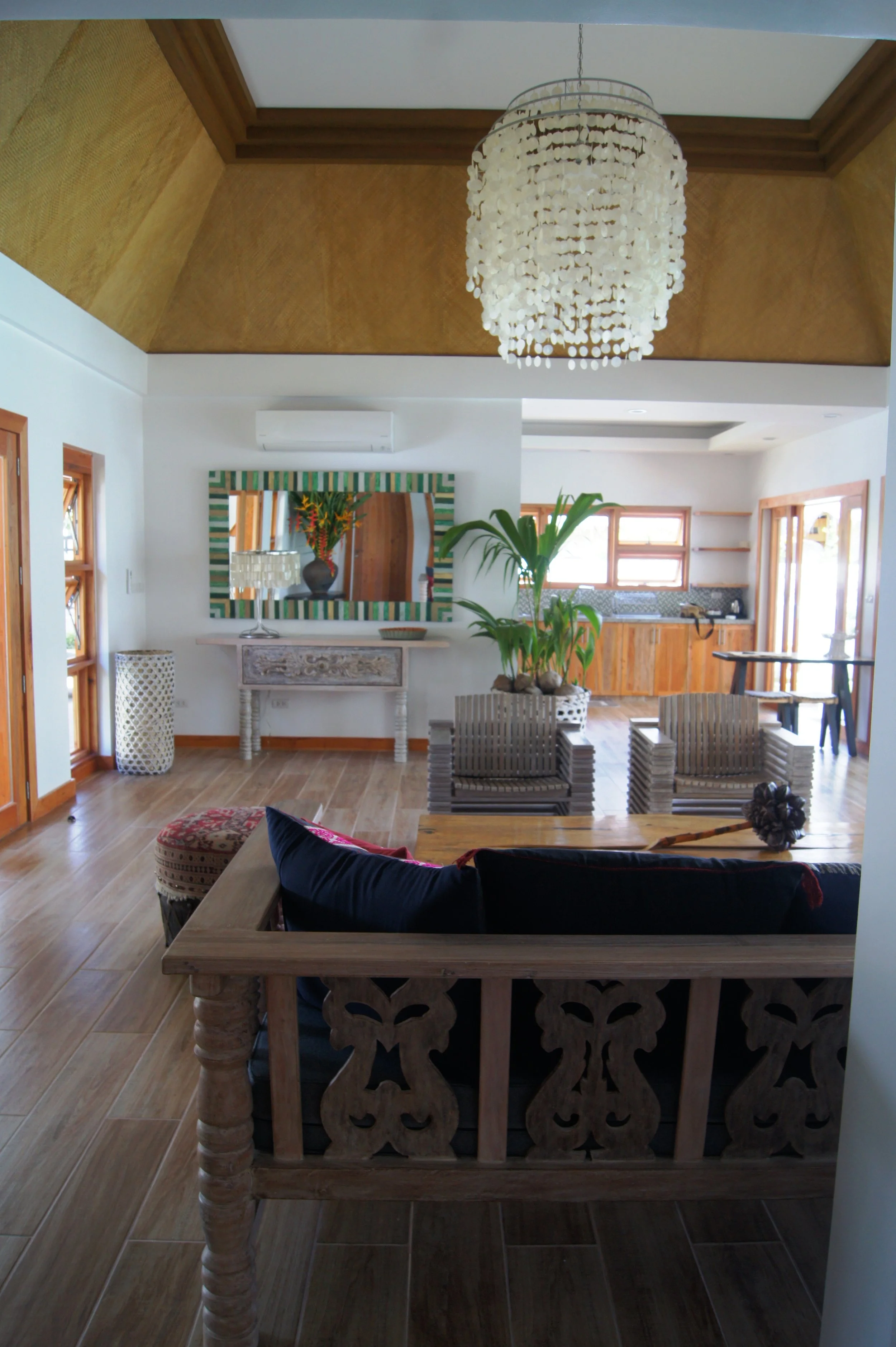 The Pura Vida Resort, an old patron since 14 years ,commissioned me the interiors of their first luxury three bedroom villas. Fiesta, is a celebration of tropical and ethnic aesthetics. Daybeds with tribal textiles, green and white stained woods, fiber weavings and shell lamps. Baskets, Rattan hammocks and boat paddles evoke the beach lifestyle.